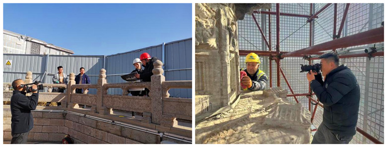 2023年12月8日,趙州陀羅尼經(jīng)幢保護工程施工現(xiàn)場,我公司技術人員攻堅克難、不畏嚴寒,依然奮斗在施工崗位。在新搭設的腳手架上,他們牢記文物保護方針,采用科學、合理的技術手段對石質文物表層結殼、結膜污染進行清理,并依照方案核對塔身各類殘損病害,為后期的修繕工作做足準備。